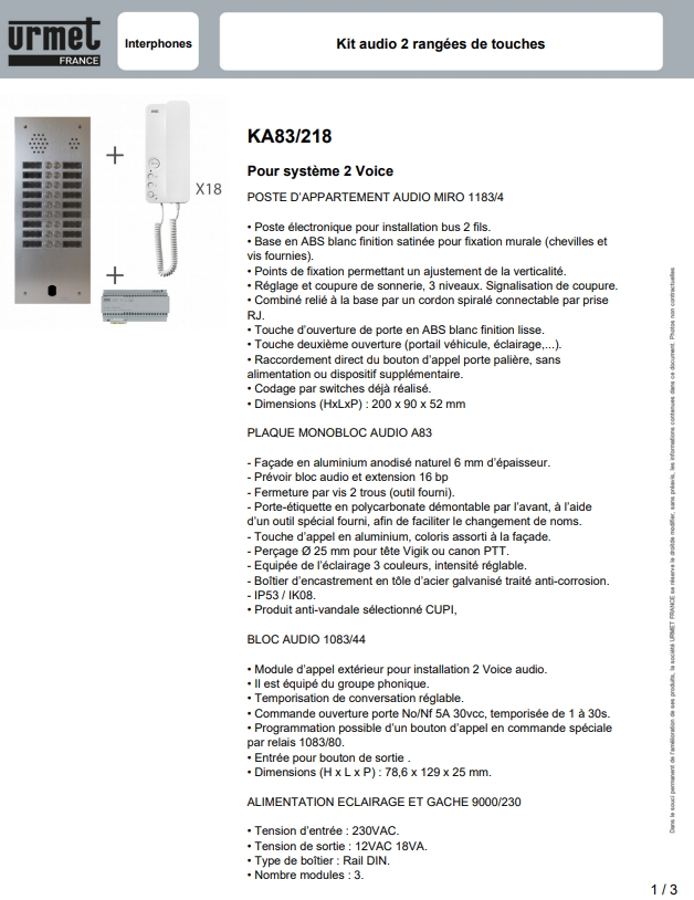KA83 218 Kit audio 18 postes complet Urmet